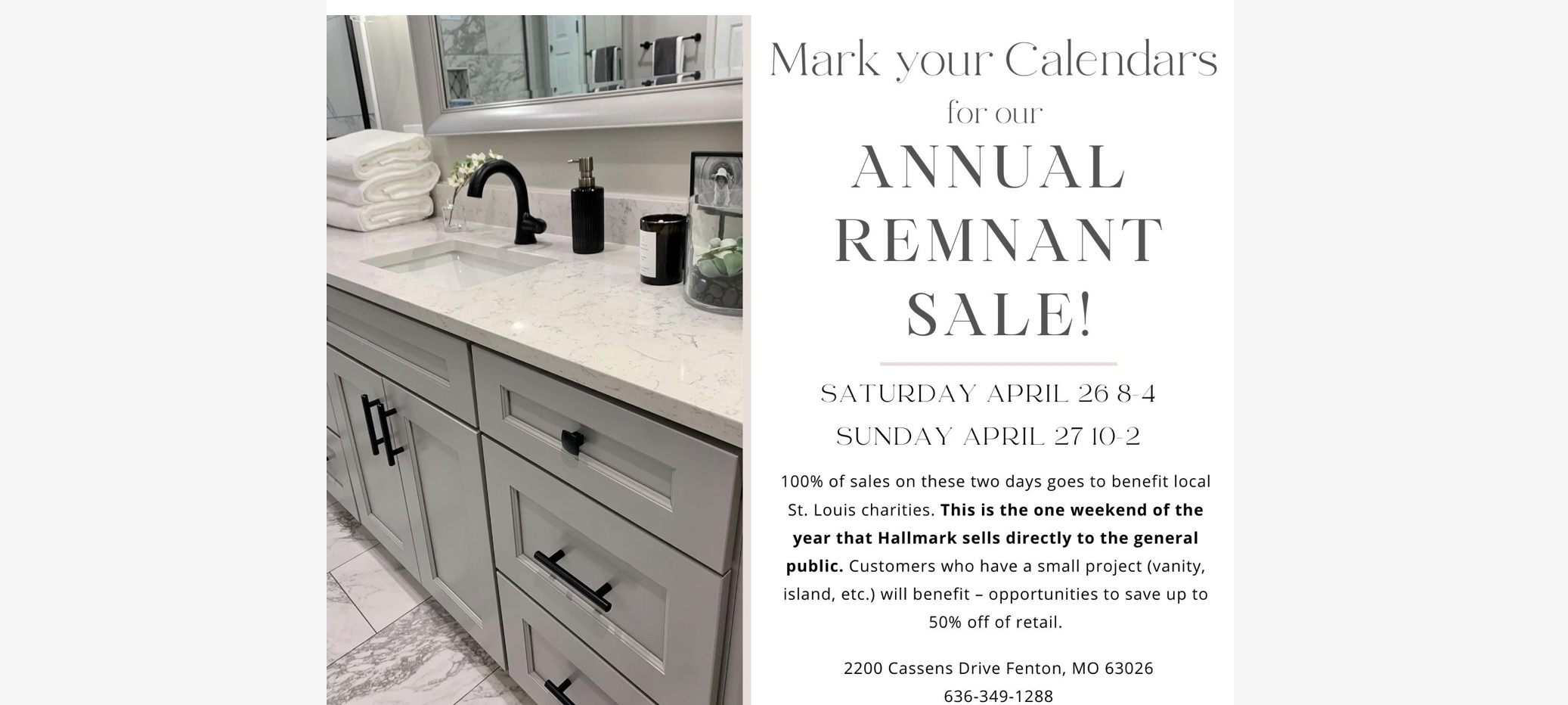 On behalf of Annie’s Hope, on April 26th & 27th only, Hallmark Stone is opening their remnants dept to the public, offering 50% off.