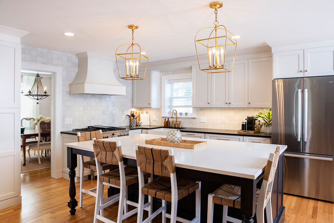 - mix metals in your fixtures – brushed nickel and black or warm metals such as copper and bronze. Or mix matte, polished or brushed finishes. You can go big with these on your island sink or make smaller changes on the island drawer pulls;