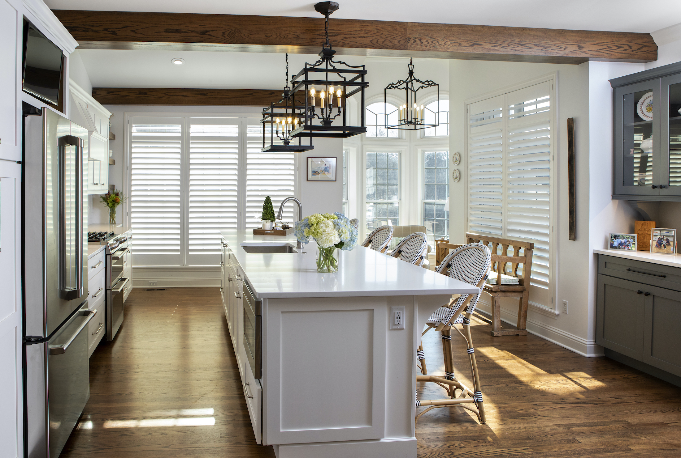 When we remodeled the kitchen for this family, we faced a challenge. The plan called for removing walls between the dining room, living room and kitchen. While this created a wonderfully open space – exactly what the homeowners wanted – it revealed structural steel beams. We had to find a way to camouflage them.